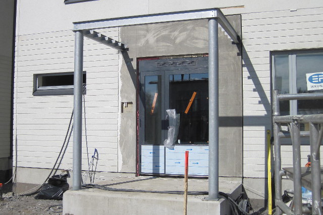 Sisäänkäynnin katoksen teräsrunko, valmistus ja asennus.